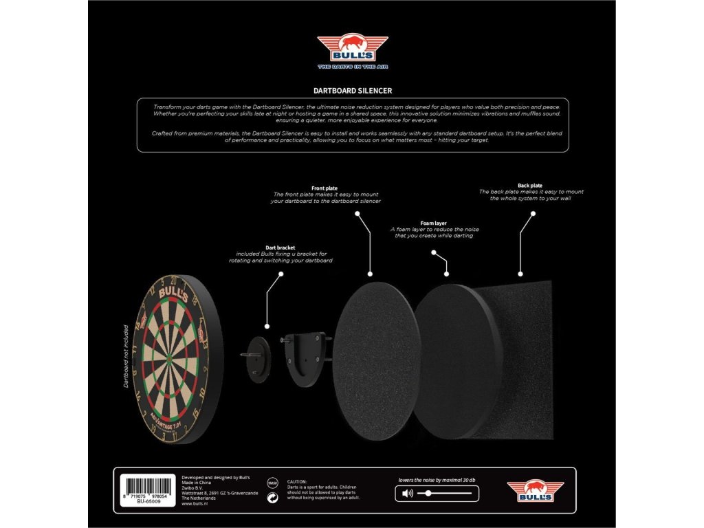Bull's Dartboard Silencer s tlmením hluku až o 30 dB a U držiakom je ideálne riešenie pre tichú hru šípok v interiéri.