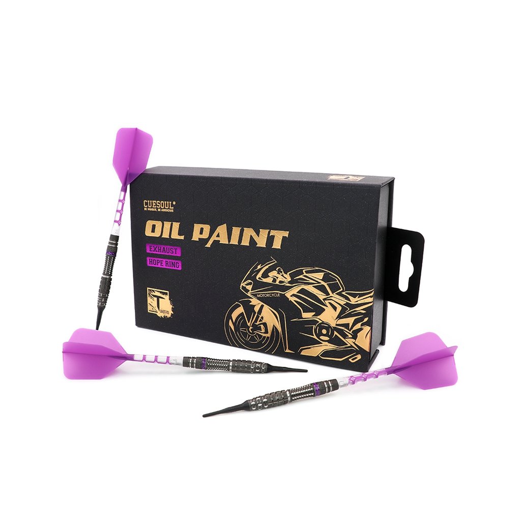 MOTORCYCLE 90% Tungsten Dart Set – Exhaust (Soft Tip) sú soft šípky s motocyklovým dizajnom, 90 % wolfrámovým barelom a výrazným fialovým „hope ring“ detailom. Hmotnosť 23 g zabezpečuje stabilný a presný hod pri hre na elektronických terčoch.