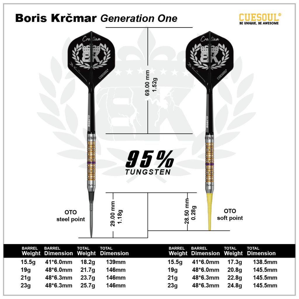 ‘Boris Krčmar’ Generation One 95% Tungsten Dart Set sú konvertibilné šípky navrhnuté v spolupráci s profesionálnym hráčom Borisom Krčmarom. V balení obsahujú soft aj steel hroty, vďaka čomu sú vhodné pre elektronické aj sisalové terče.