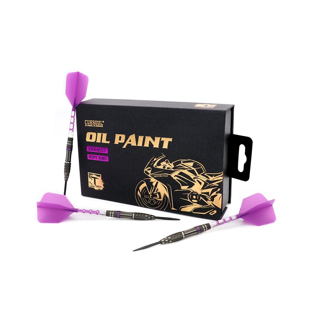 MOTORCYCLE 90% Tungsten Dart Set – Exhaust sú steel šípky s motocyklovým dizajnom, 90 % wolfrámovým barelom a výrazným fialovým „hope ring“ detailom. Hmotnosť 25 g ponúka stabilný a kontrolovaný hod pre hru na sisalových terčoch.