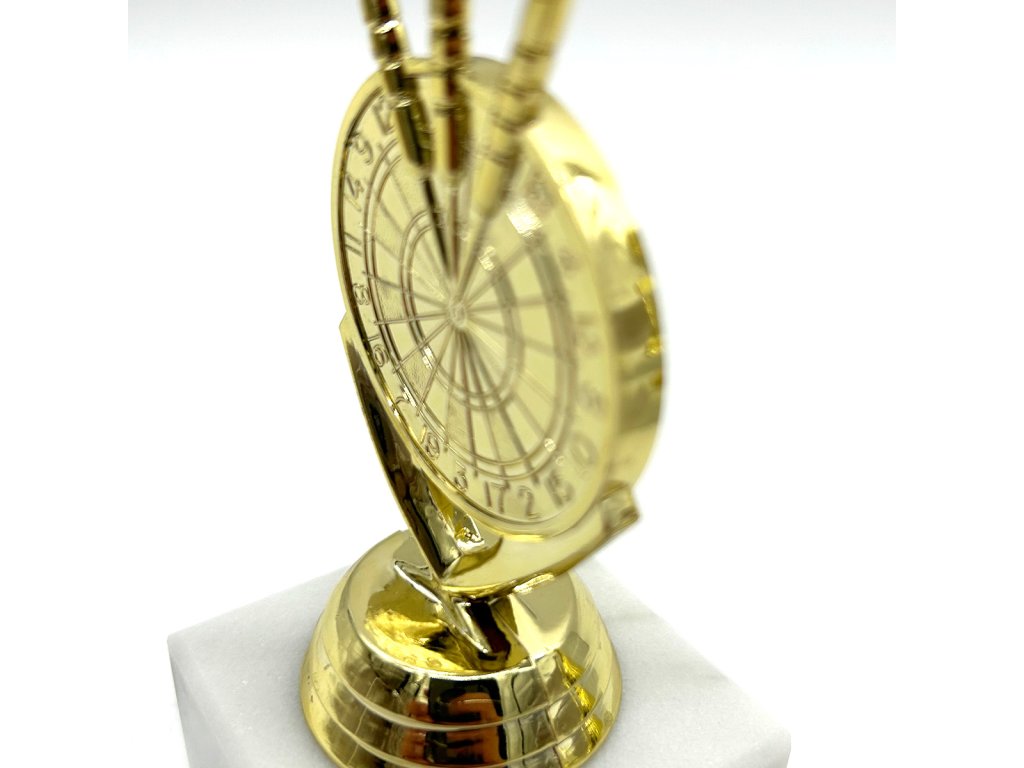 Elegantná šípkarská trofej s terčom a troma šípkami na mramorovom podstavci, výška 150 mm.