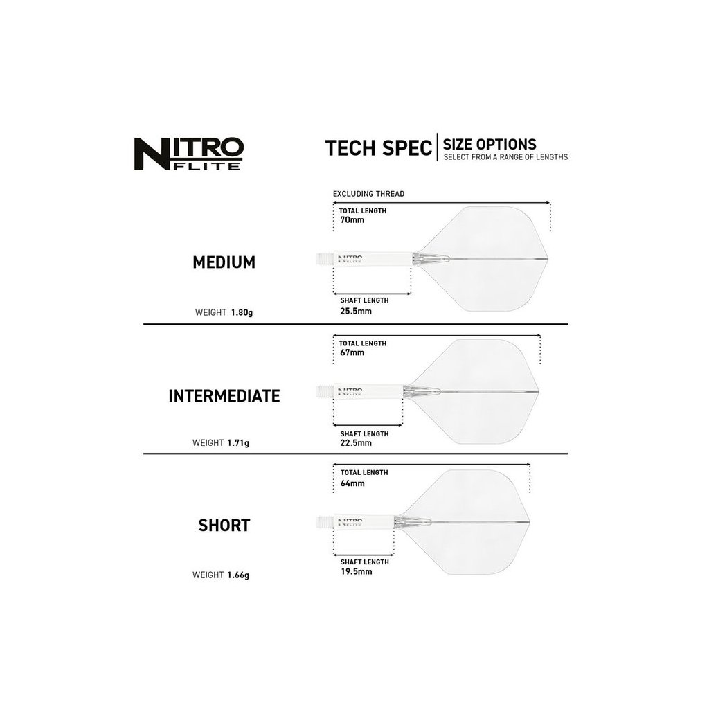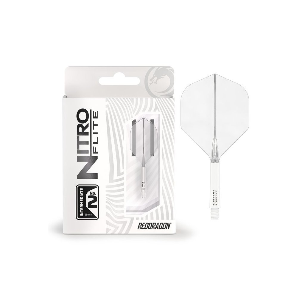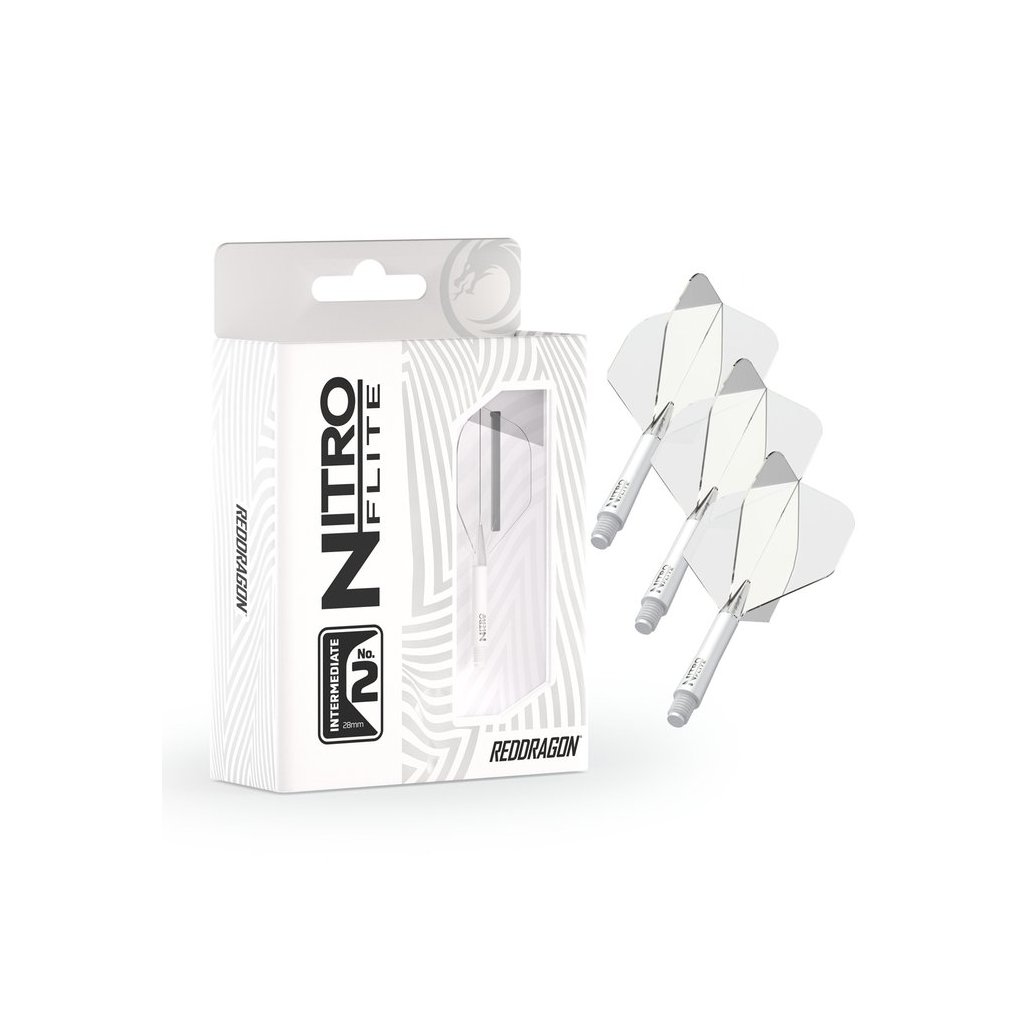 Nitro Dart Flite White & Clear #2 sú integrované letky s násadkou v štandardnom tvare No.2, ktoré ponúkajú vysokú odolnosť, stabilný let a čistý bielo-priehľadný dizajn. Dostupné v dĺžkach Short, Intermediate a Medium.