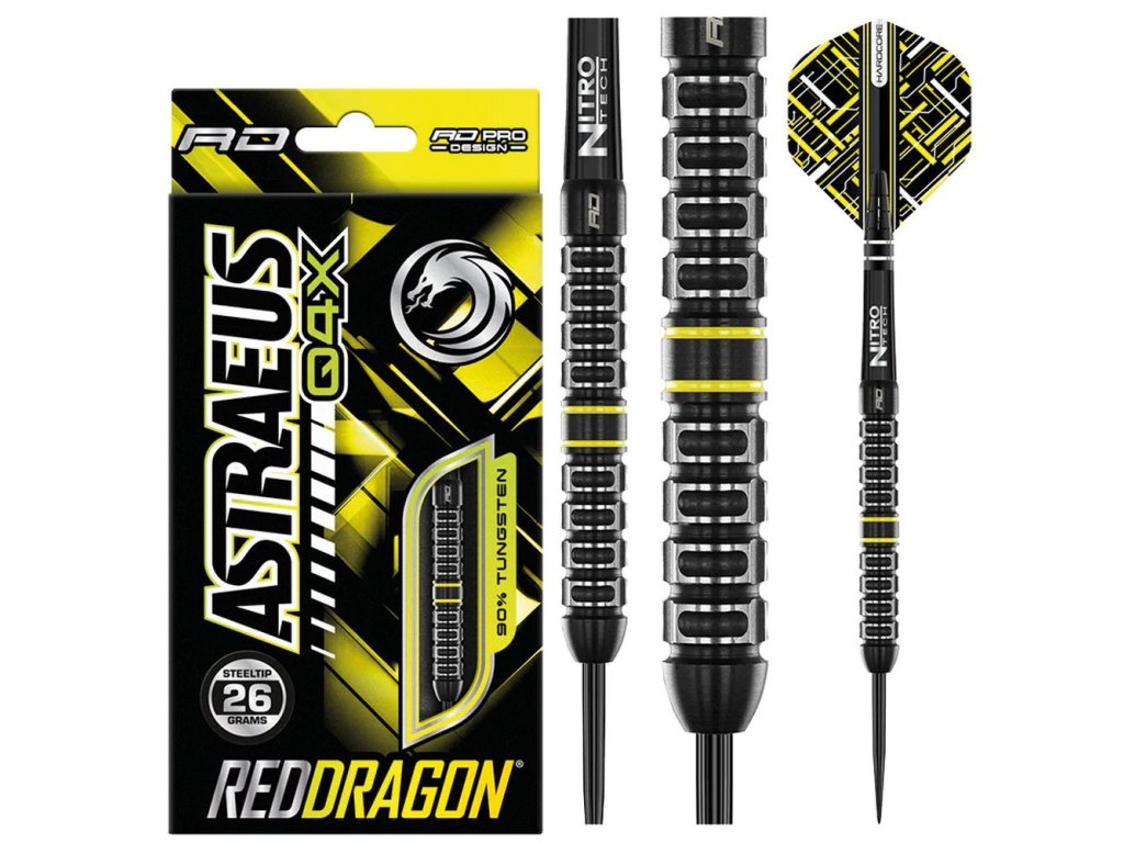 Sada steel šípok Red Dragon Astraeus Q4X Parallel 26g, 90% wolfram. Profesionálna súprava pre skúsených hráčov, vhodná na hádzanie do sisalových terčov. Novinka pre rok 2024.