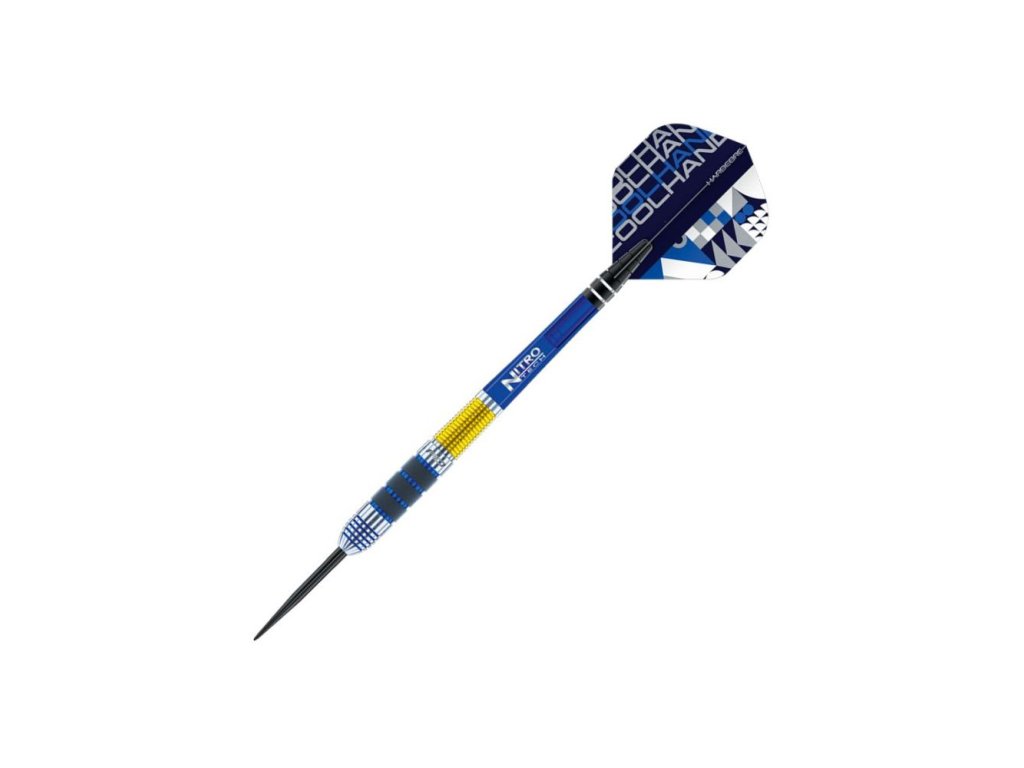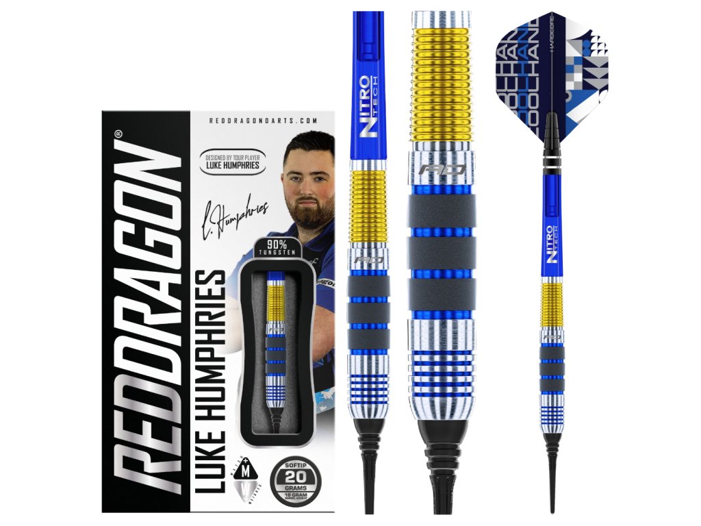 Steel šípky Red Dragon Luke Humphries sú určené pre profesionálne použitie, s hmotnosťou 21g a vyrobené z 90% wolfrámu. Tieto šípky majú telíčka s rozmermi 7,2mm v priemere a 43,2mm v dĺžke, doplnené o strieborný povrch s dekoratívnymi čiernymi, modrými a zlatými drážkami. Sú ideálne pre hru na sisalových terčoch.