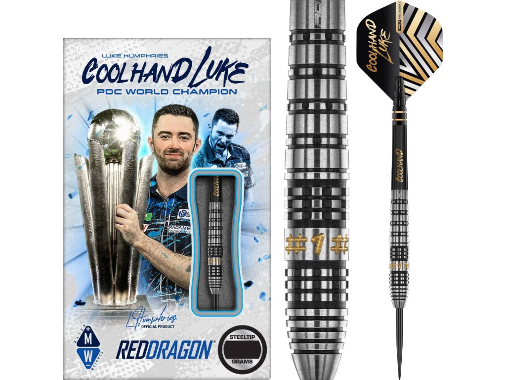 Profesionálne šípky Luke Humphries 90% wolfram, 25,9 g s torpédovým tvarom, jemným viacprstencovým gripom a komponentmi Red Dragon.