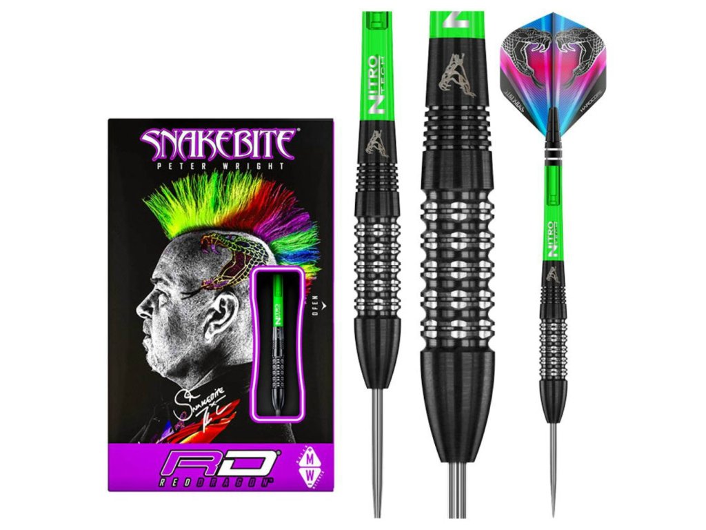 Balenie obsahuje 3 šípky Red Dragon Peter Wright Snakebite Black Strike s hmotnosťou 24g a sú vyrobené z 90% wolfrámu.