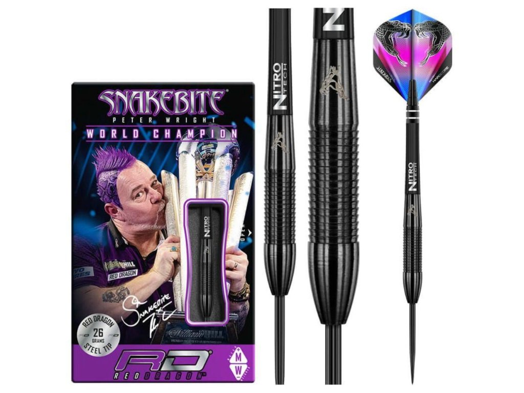 Šípky Red Dragon steel Peter Wright Snakebite 3 Black, 26g, 90% wolfram sú navrhnuté na základe skúseností Petera Wrighta z PDC Premier League. Po jeho úspechu a zisku druhého miesta na PDC svetovom šampionáte v roku 2014, Wright svoje šípky zdokonalil, čo viedlo k vytvoreniu týchto špecifických 26g šípok s čiernym PVD povlakom pre vylepšený úchop.
