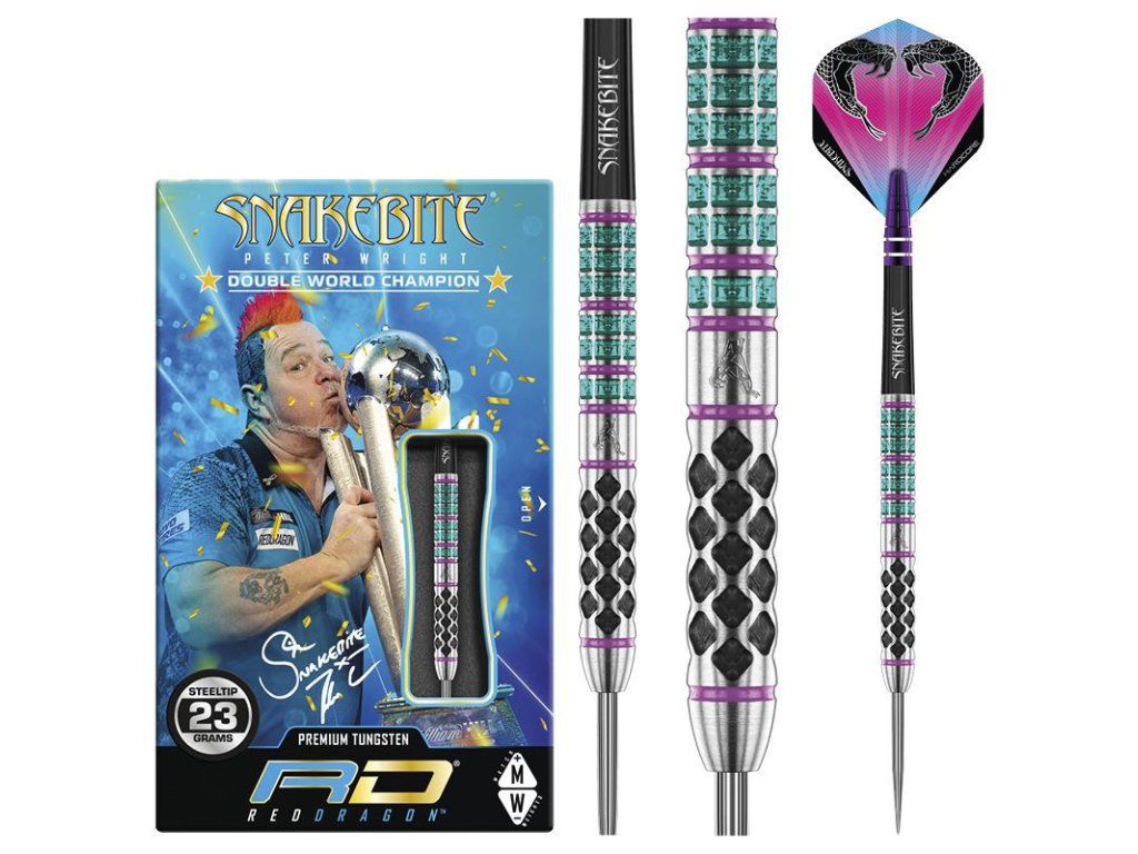 The package includes 3 pieces of Red Dragon steel Peter Wright Snakebite Supa-Venom 23g darts with a 90% tungsten composition. Please note, no discounts can be applied to the Red Dragon steel Peter Wright Snakebite Supa-Venom 23g darts.