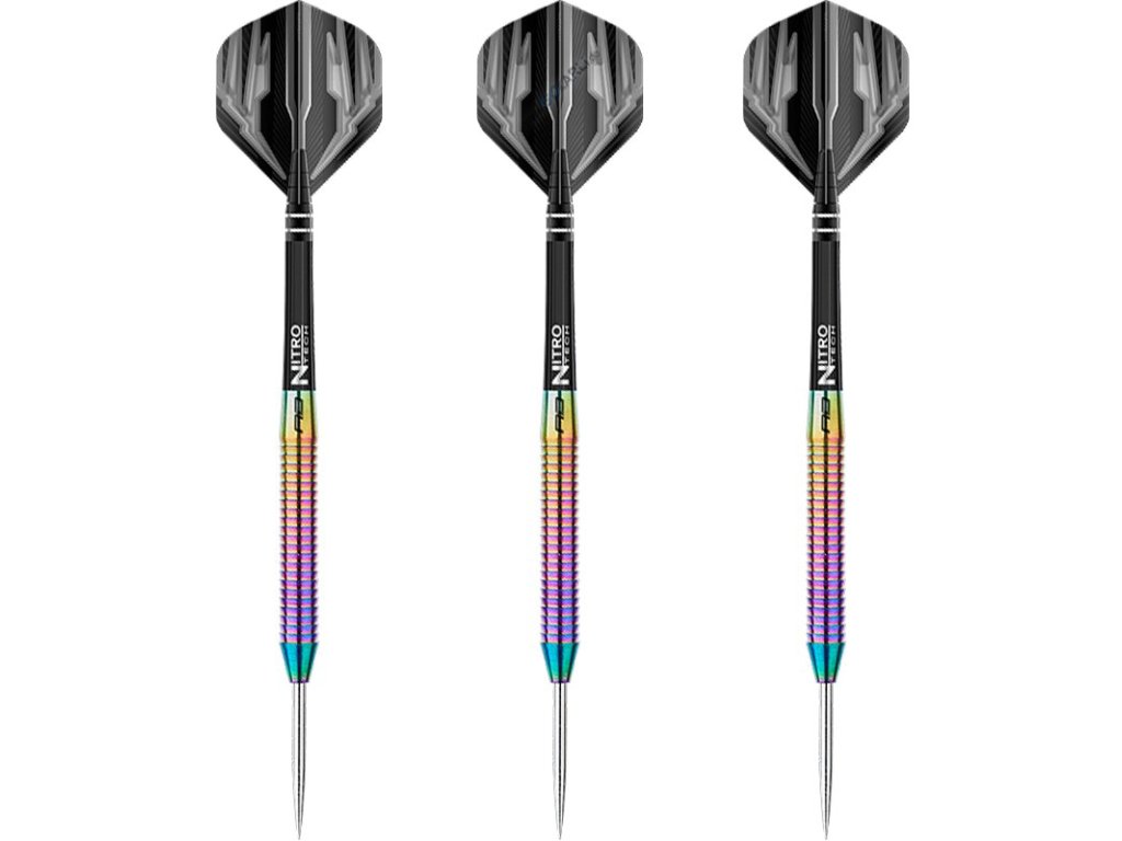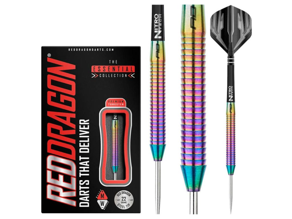 Šípky Red Dragon steel Razor Edge Spectron 22g, 85% wolfram, 6,5mm hrúbka, 50,8mm dĺžka, dúhová farba, 3 kusy v balení.