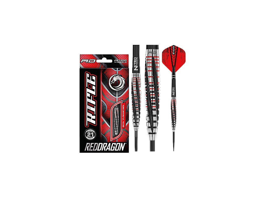Sada steel šípok Red Dragon Rifle 23g, 90% wolfram, vhodná pre skúsených hráčov, pevné kovové hroty, evolučné drážky.