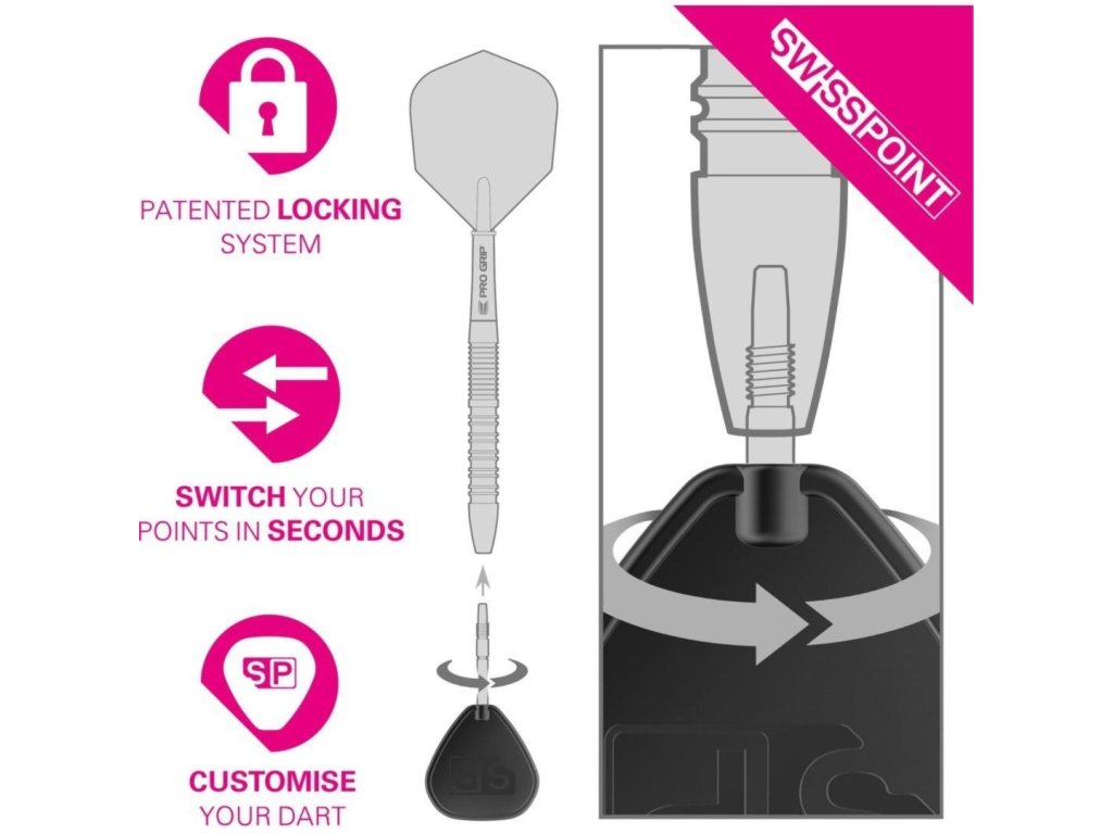 Kovové hroty Target Swiss Point poskytujú možnosť rýchlej výmeny dĺžky, štýlu a farby hrotu v priebehu niekoľkých sekúnd, a to pomocou praktického vreckového nástroja Swiss Point Tool. Tieto hroty sú špeciálne navrhnuté na použitie so šípkami označenými ako Swiss, čo zaručuje ich kompatibilitu a spoľahlivé uchytenie. S Target Swiss Point hrotmi si môžete prispôsobiť šípky podľa svojich preferencií a získať výhodu v každom hode.
