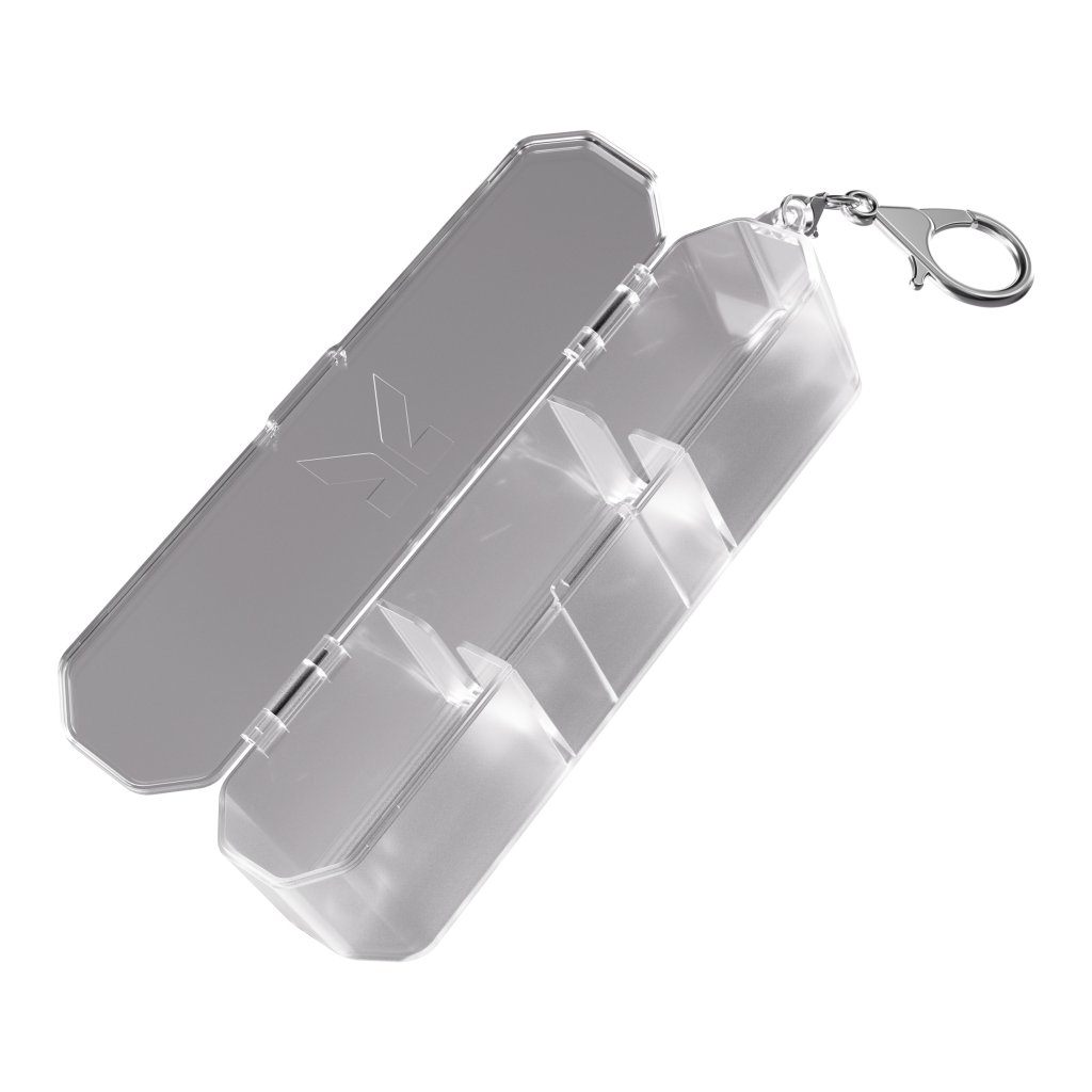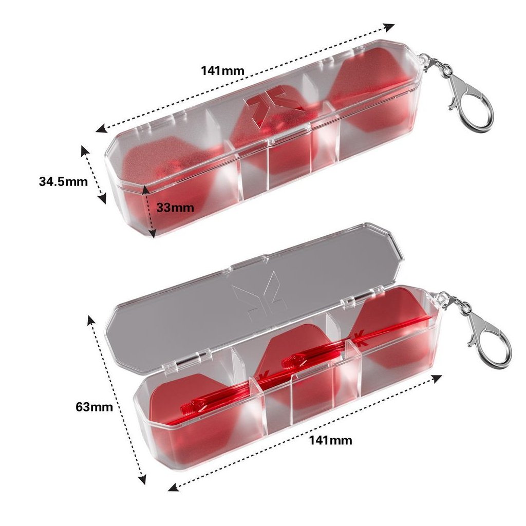 Transparentný plastový box na 1 sadu Target K-Flex letiek, dĺžka 42 mm, priemer 7,4 mm, s kovovou karabínou, odolné vyhotovenie, bez letiek v balení.