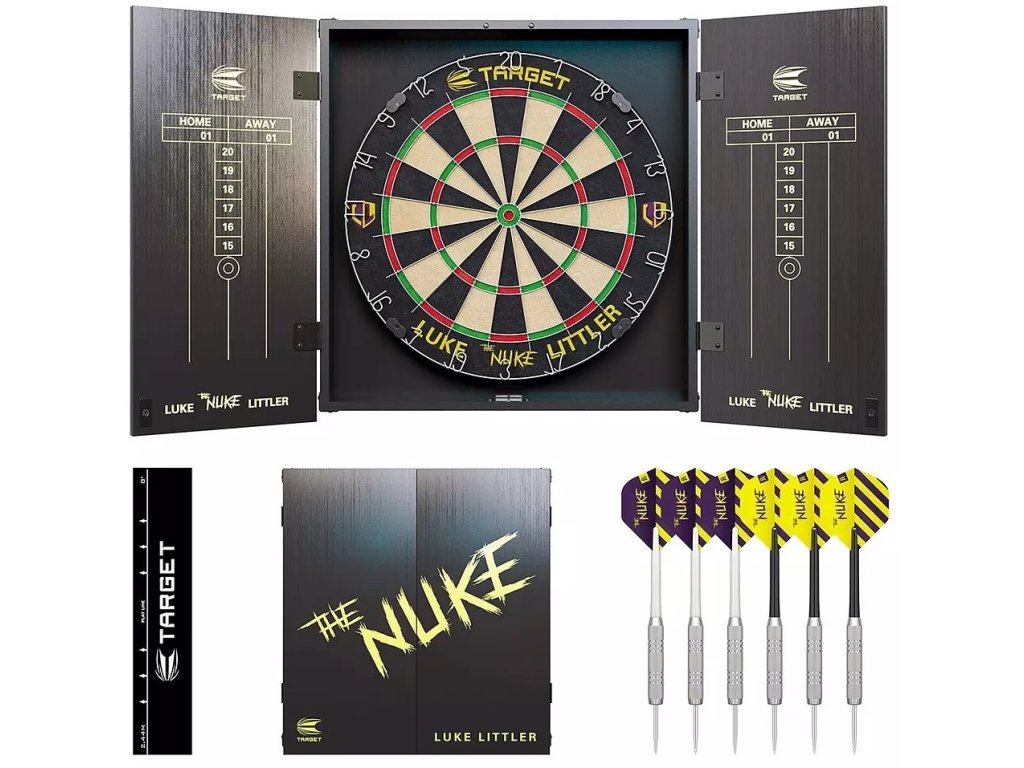 Prémiový kabinet Luke Littler obsahuje sisalový terč s ultra tenkým drôtom, 2 sady steelových šípok, terčovú skrinku a príslušenstvo.