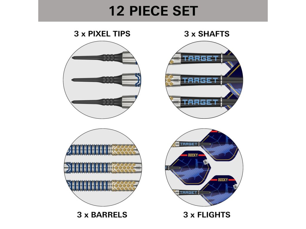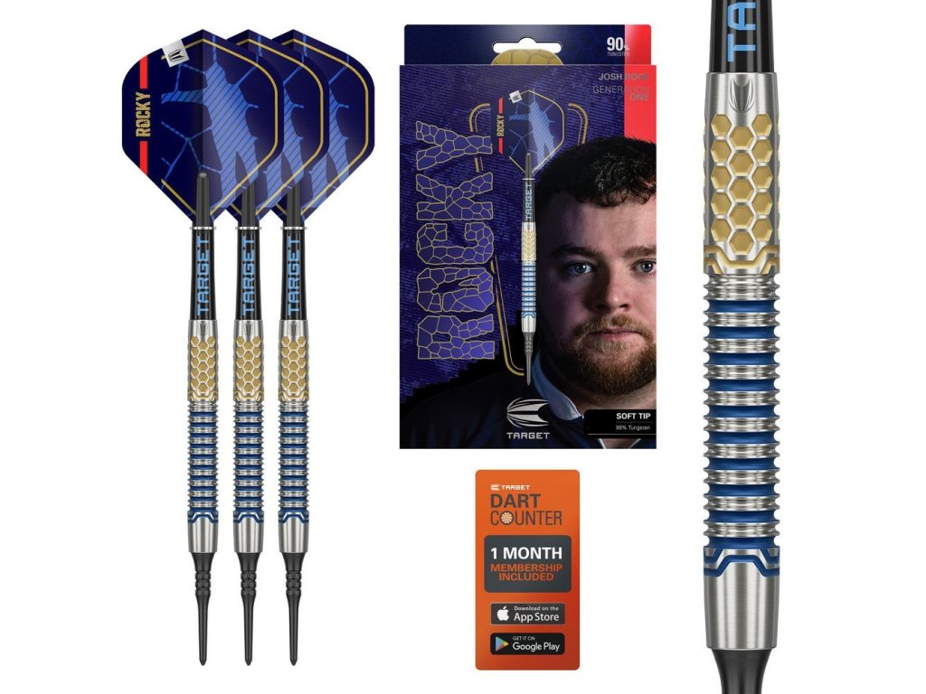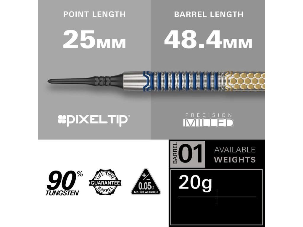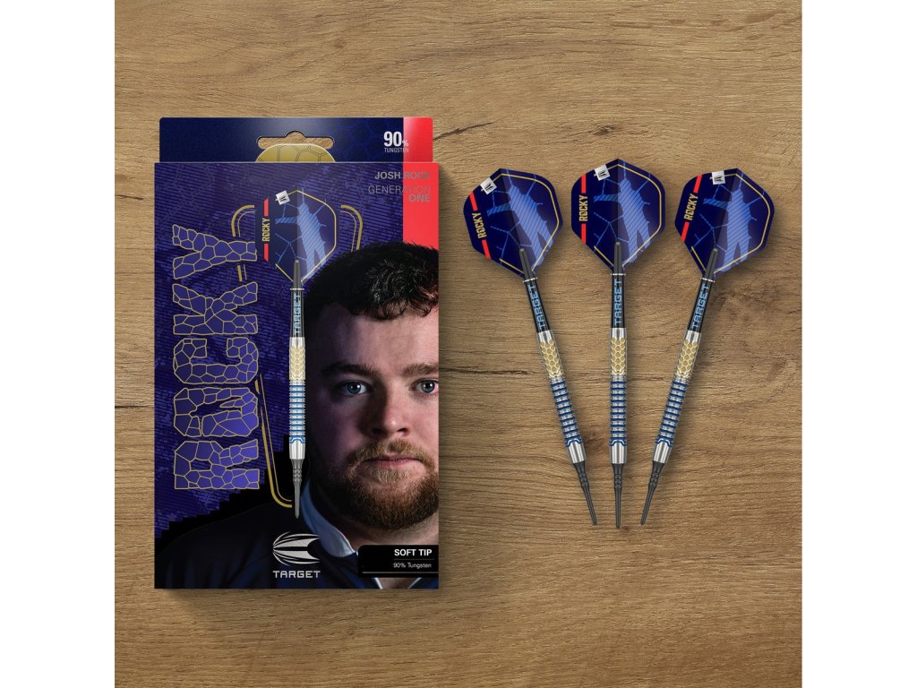 Soft šípky Target Josh Rock G1 20g, 90% wolfrám. Rovný barrel s geometrickým gripom (6,4 mm x 48,4 mm), Pixel hroty (2BA), Pro Grip TAG shafty (34 mm), Pro.Ultra No.2 letky s UV ochranou.