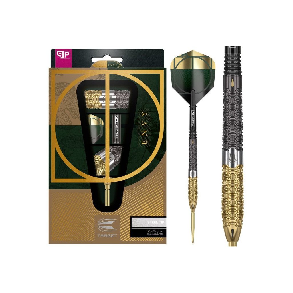Sada steel šípok Target Cult Envy 02 23g SP, 90% wolfram. Luxusné šípky s vymeniteľnými hrotmi, vhodné na hádzanie do sisalových terčov.