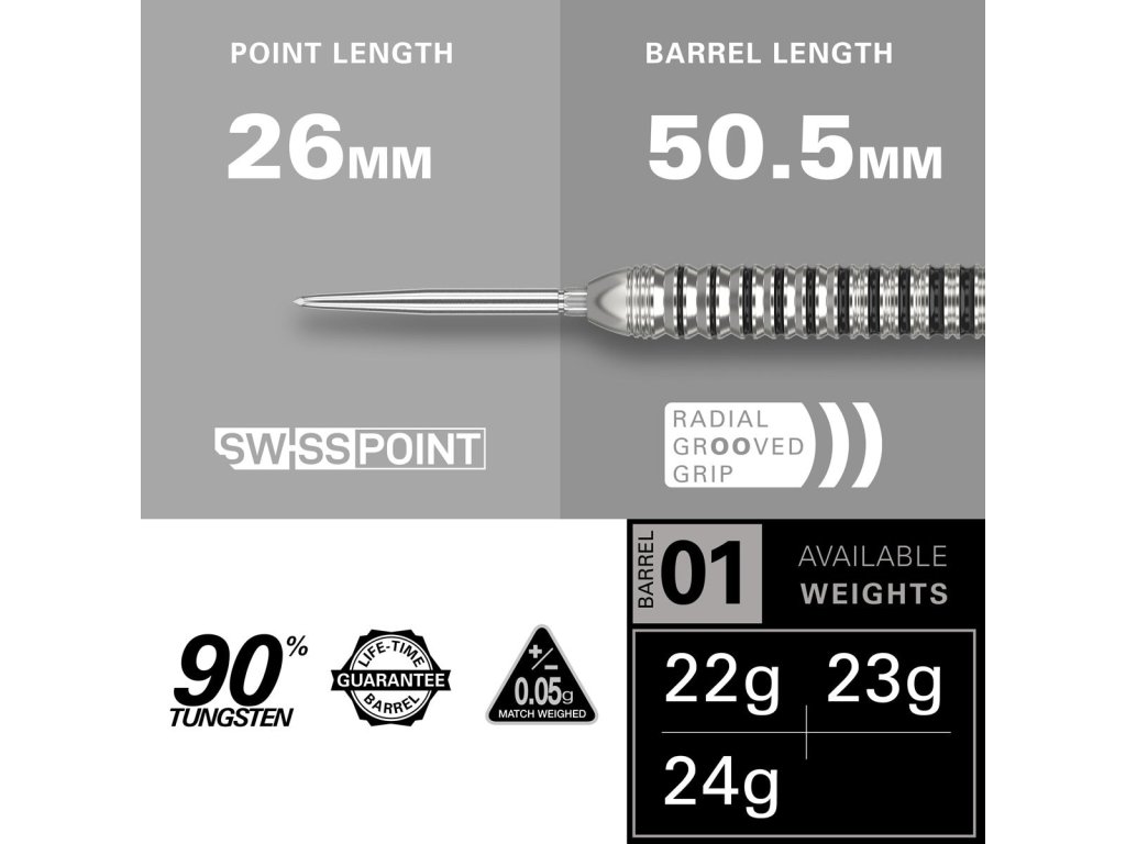 Šípky Target Exo 01 Swiss Point sú ideálnou voľbou pre všetkých hráčov, ktorí vyžadujú vysokú presnosť, elegantný dizajn a inovatívne technológie. Tieto šípky s váhou 23 g ponúkajú optimálny výkon vďaka použitiu 90% tungstenového barrelu, ktorý zabezpečuje dokonalú rovnováhu medzi hmotnosťou a štíhlosťou.