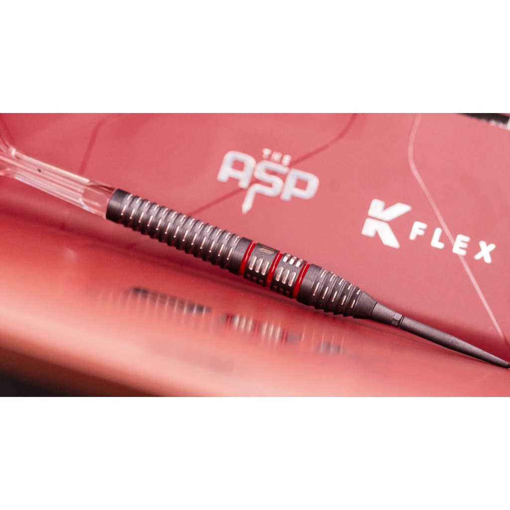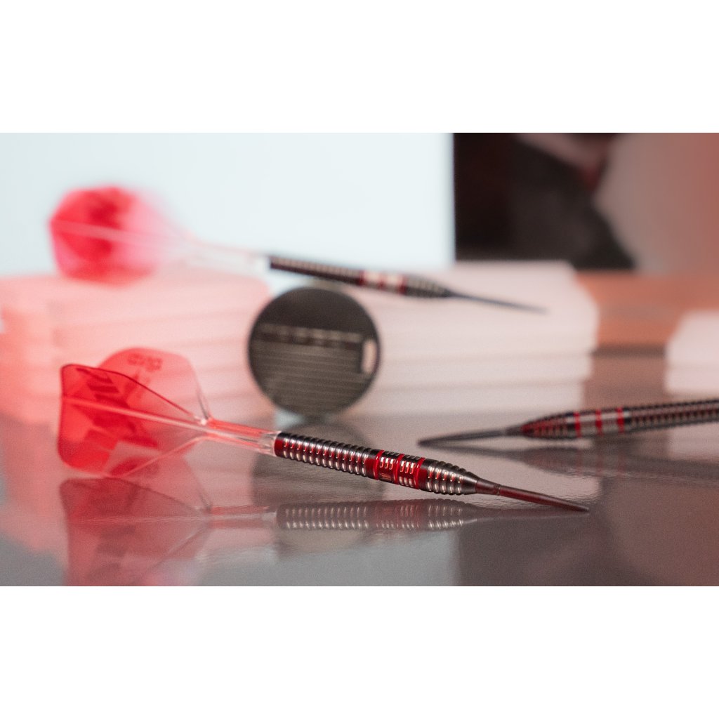 Každý barrel je precízne opracovaný z 95% wolframu s predným zužujúcim sa profilom, ktorý kopíruje preferovaný úchop Nathana Aspinalla. Vďaka CNC obrábaniu a viacerým fázam re-machiningu získava šípka unikátnu kombináciu textúr pre výnimočný grip. Čierny PVD povrch dodáva nielen prémiový vzhľad, ale aj zvýšenú odolnosť proti opotrebovaniu. Červené prstencové prvky vytvárajú kontrastný dizajn, ktorý zaujme aj na oche.