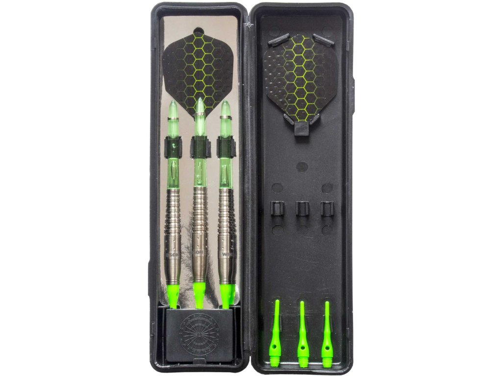 Sada šípok s 18g wolfrámovým barelom, plastovým hrotom, nylonovou násadkou a letkou s metalickým potlačom.