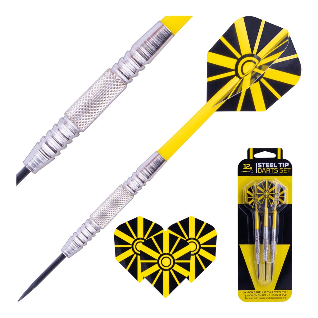 Sada obsahuje klasické steel šípky s oceľovým hrotom, ktoré sú určené pre sisalové terče. Železný barel s jemným vrúbkovaním zabezpečuje pevný úchop a lepšiu kontrolu pri hode.