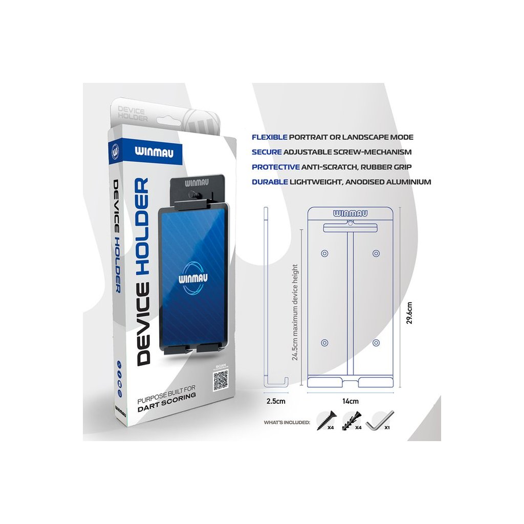 Winmau Darts Device Holder je praktický držiak na mobilné zariadenia alebo tablety, ktorý umožňuje mať skórovacie aplikácie, štatistiky či tréningové nástroje vždy prehľadne na očiach počas hry.