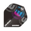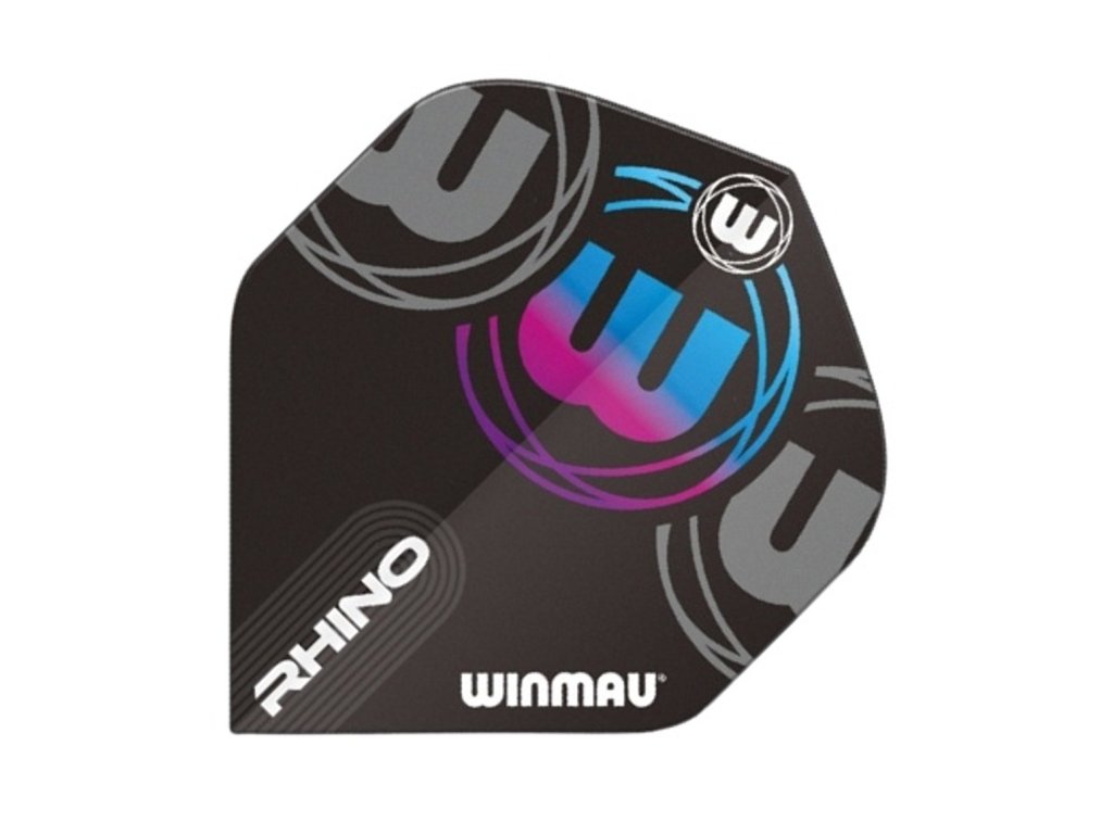 Letka na má štandardný tvar s výrazným čiernym pozadím a elegantným dizajnom. Je na nej logo Winmau a značka RHINO, ktorá je umiestnená v spodnej časti. Na letke sú viditeľné farebné akcenty v modrej a fialovej farbe, ktoré dodávajú moderný vzhľad.