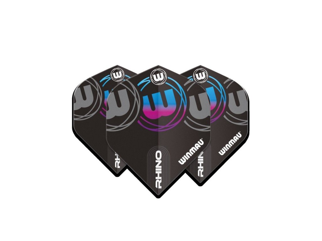 Letka na má štandardný tvar s výrazným čiernym pozadím a elegantným dizajnom. Je na nej logo Winmau a značka RHINO, ktorá je umiestnená v spodnej časti. Na letke sú viditeľné farebné akcenty v modrej a fialovej farbe, ktoré dodávajú moderný vzhľad.