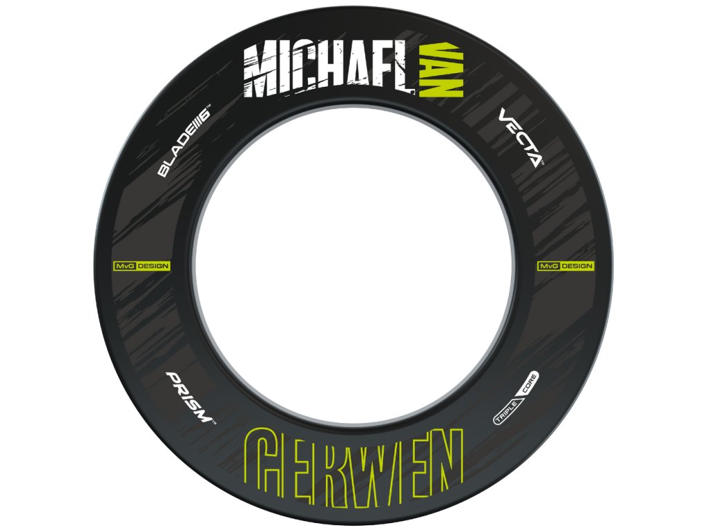 Prezentujeme novinku v kolekcii MvG od Winmau - ochranný gumový prstenec pre terče. Tento produkt je navrhnutý s elegantnou čiernou farbou, doplnený o charakteristické zelené detaily a logá Michaela van Gerwena, vrátane nápisu Winmau a špecifických dizajnových prvkov MvG.