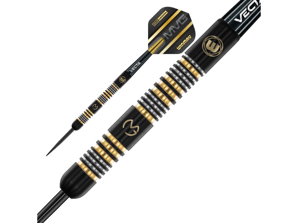 Winmau steel šípky MvG Trilogy 24g, 90% wolfram, 6,4 mm priemer, 50,8 mm dĺžka, MvG Design Vecta násadky, MvG Prism Delta letky.