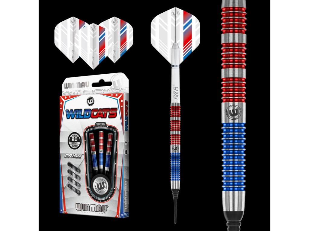 Winmau steel Wildcats 23g, 90% wolfram. Šípky pre skúsených hráčov, hmotnosť 23g, materiál 90% wolfram, priemer 6,5 mm, dĺžka 54,6 mm. S pevnými kovovými hrotmi a Prism Force a Prism Alpha letkami.