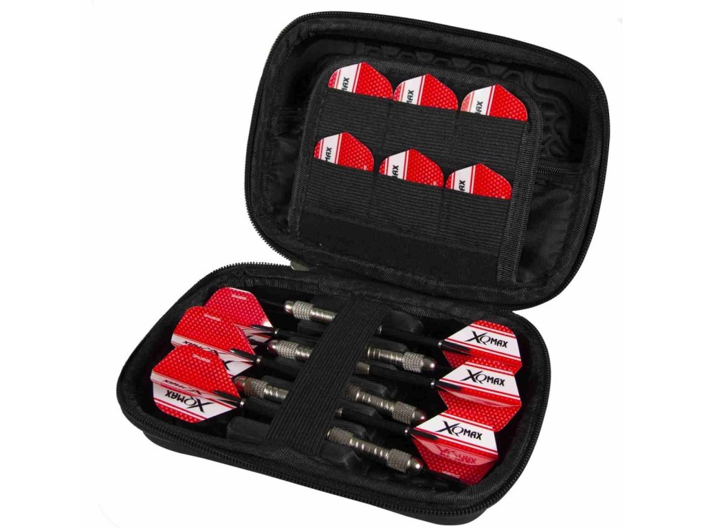 Pevné veľké púzdro na šípky XQMax s rozmermi 19 × 13 × 5 cm chráni dve sady zložených šípok bez nutnosti demontáže letiek a obsahuje vnútorné vrecká na príslušenstvo.