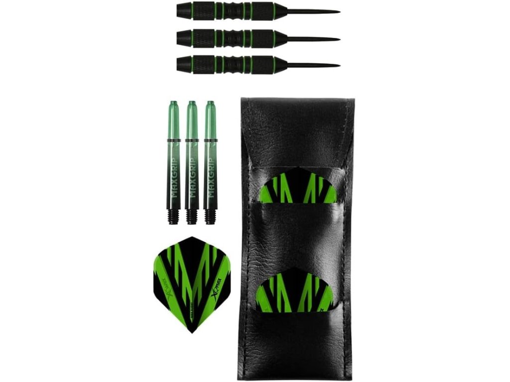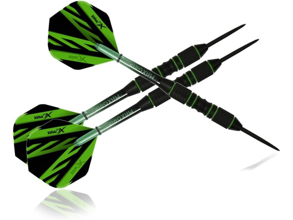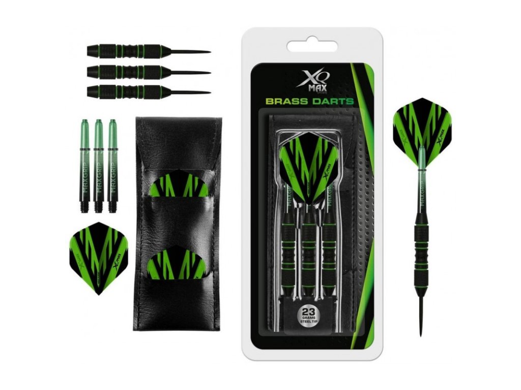 - 3 kompletné steel šípky (XQ MAX Black/Green Coated, 23g, Brass)